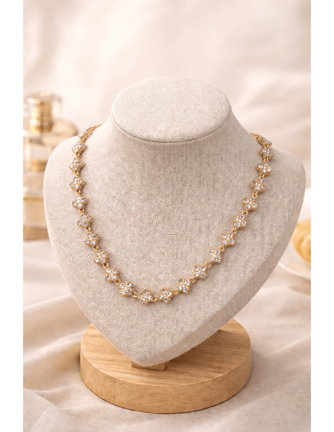 Delicado, elegante y lleno de brillo, este collar dorado combina pequeñas flores con piedras blancas que iluminan cualquier look.